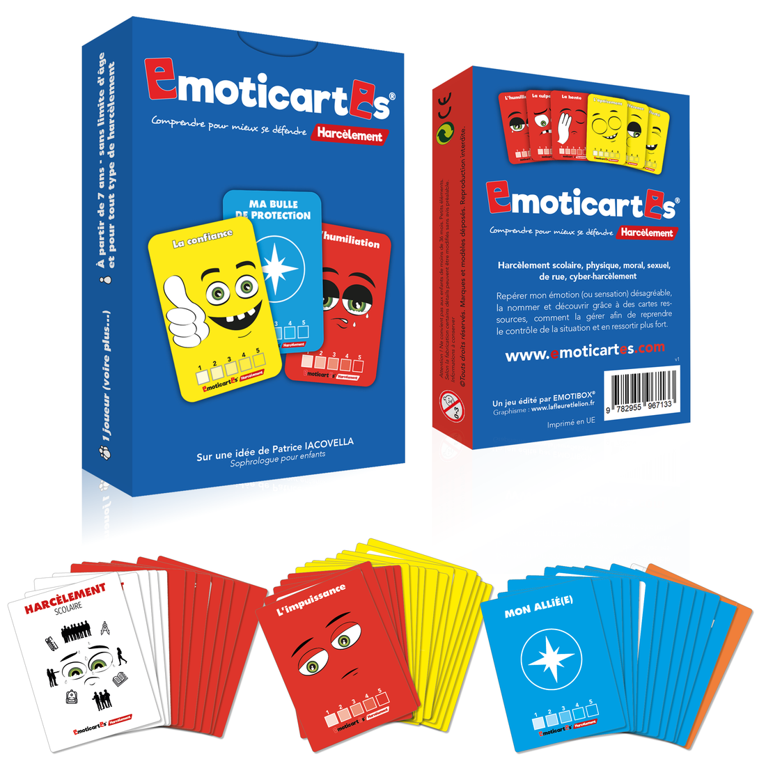 Emoticartes Enfants s’adresse à des enfants à partir de 6 ans car les explications sont simples et claires pour cet âge-là. Il peut être utilisé à la maison, à l’école ou avec un professionnel Emoticartes Adultes s’adresse Emoticartes Harcèlement s’adresse aux personnes enfant, ados ou adultes, victimes de harcèlement ou ayant été victime, mais également aux harceleurs.
